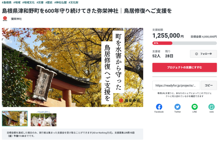 たくさんの方の想いを乗せた鳥居となるよう、達成に向けて一同頑張ってまいりますので、引き続きの応援、ご支援をどうぞよろしくお願い致します。