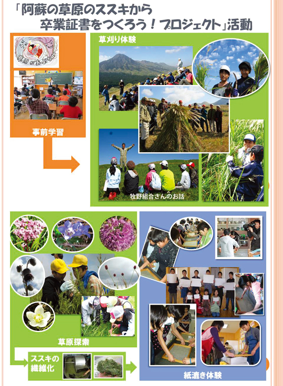 体験型草原環境学習「阿蘇の草原のススキから卒業証書をつくろう!プロジェクト」は、子ども達に、知ってもらう、感じてもらう、やってみてもらう 体験を通じて、阿蘇地域のすべての子ども達が、地域で守り継がれてきた草原について理解を深め、興味を持たせることを目的とした活動を行っています。
