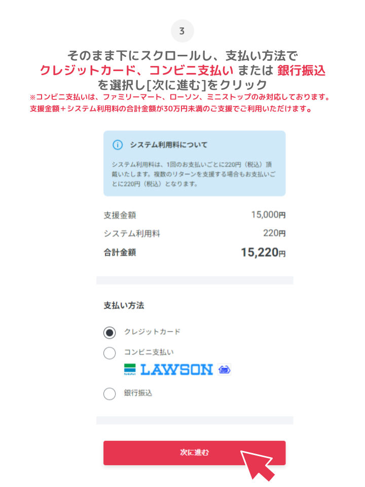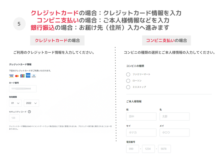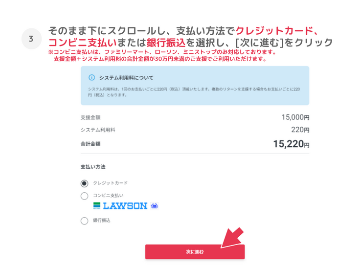 ご支援について、ご利用のスマートフォンまたはパソコン環境と、ご支援の方法に合わせて流れを作成しております。操作方法がわからない方はご確認いただけましたら幸いです。