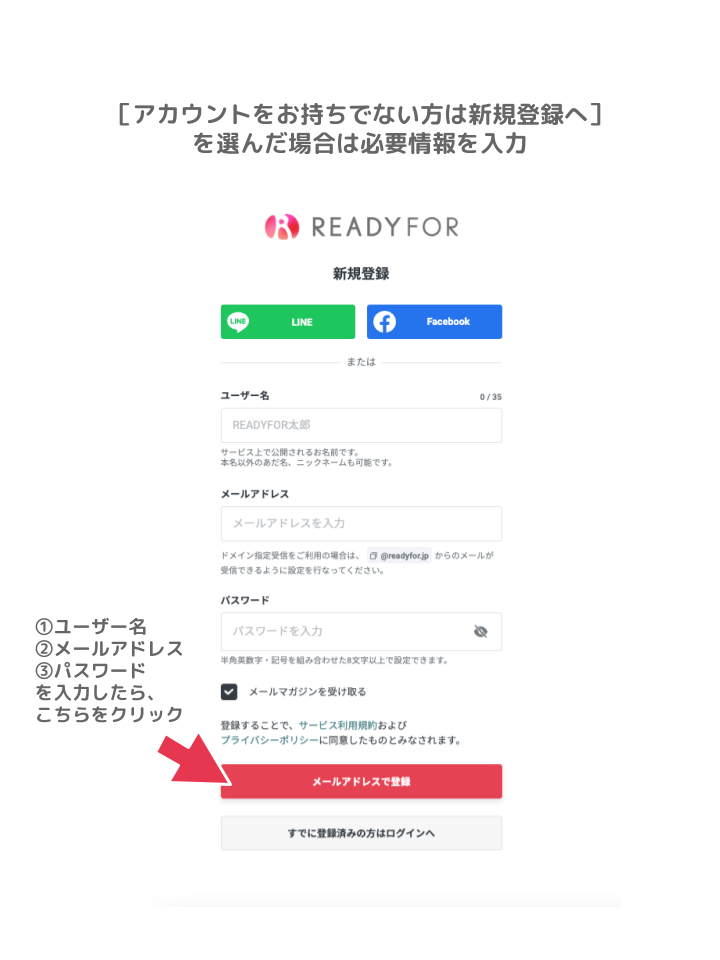 READYFOR TOPページの右上にある【ログイン・登録】をクリックしてください。新規登録時(最初のご支援時)に選んだ方法(※メールアドレスまたはFacebook、LINEアカウントでの登録)でログインをお願いいたします。
