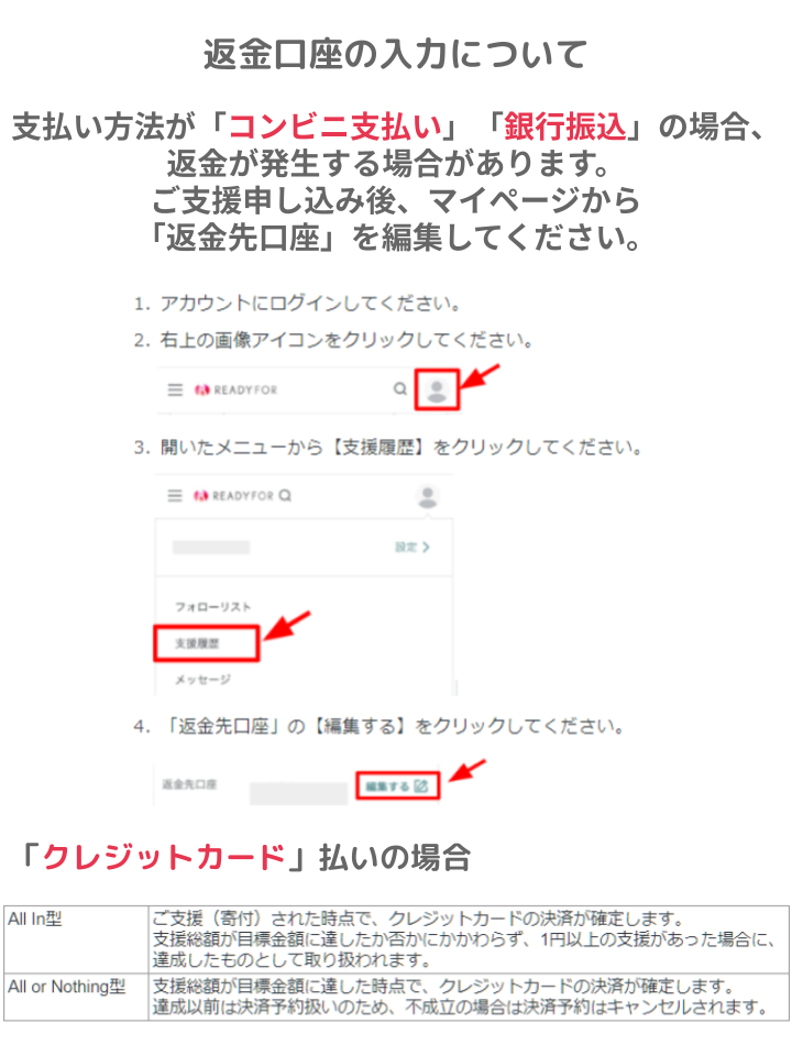 本クラウドファンディングへのご支援には、事前に「READYFOR」のアカウント登録が必要になります。※メールアドレスからのご登録、またはFacebook、LINEのアカウントからでも登録が可能です。ご支援の方法としては、「クレジットカード(JCB/VISA/MasterCard/AMEX/Diners)」、「銀行振込」、「コンビニ支払い」のいずれかをお選びいただけます。