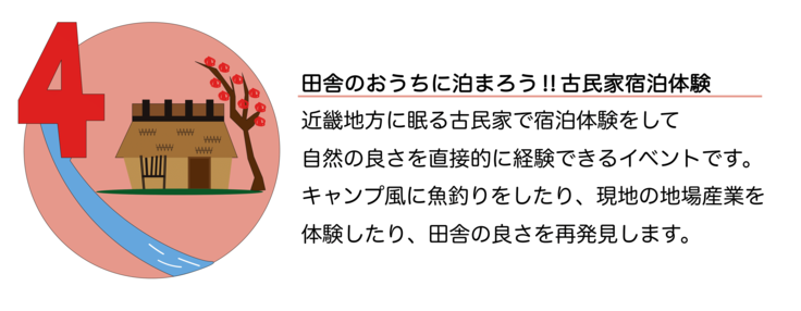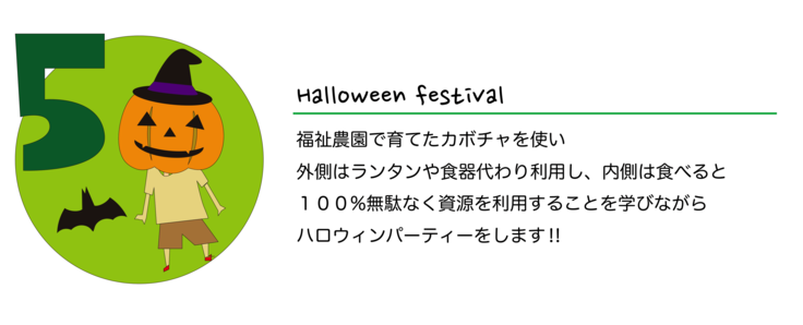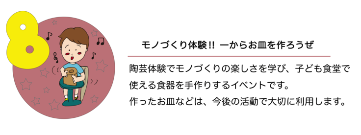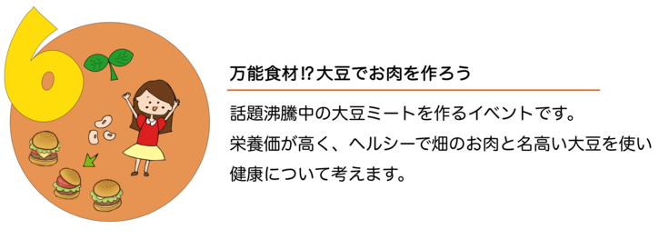 ①ただ食事をして、帰るのではなく、自然や環境について考える入口として、子どもたちが自ら考えて、食について考える10のイベントプログラムを実施したい。