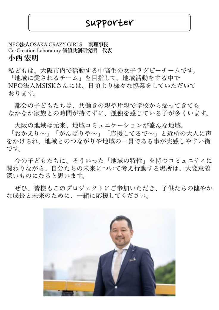また、社会問題にもなっている子どもが一人でご飯を食べる「孤食」や子ども会などの減少による地域の繋がりを構築し、社会から取り残される子たちのセーフティーネットになるように児童相談所や区役所などと連携しながら、活動に取り組んで行きたいです。