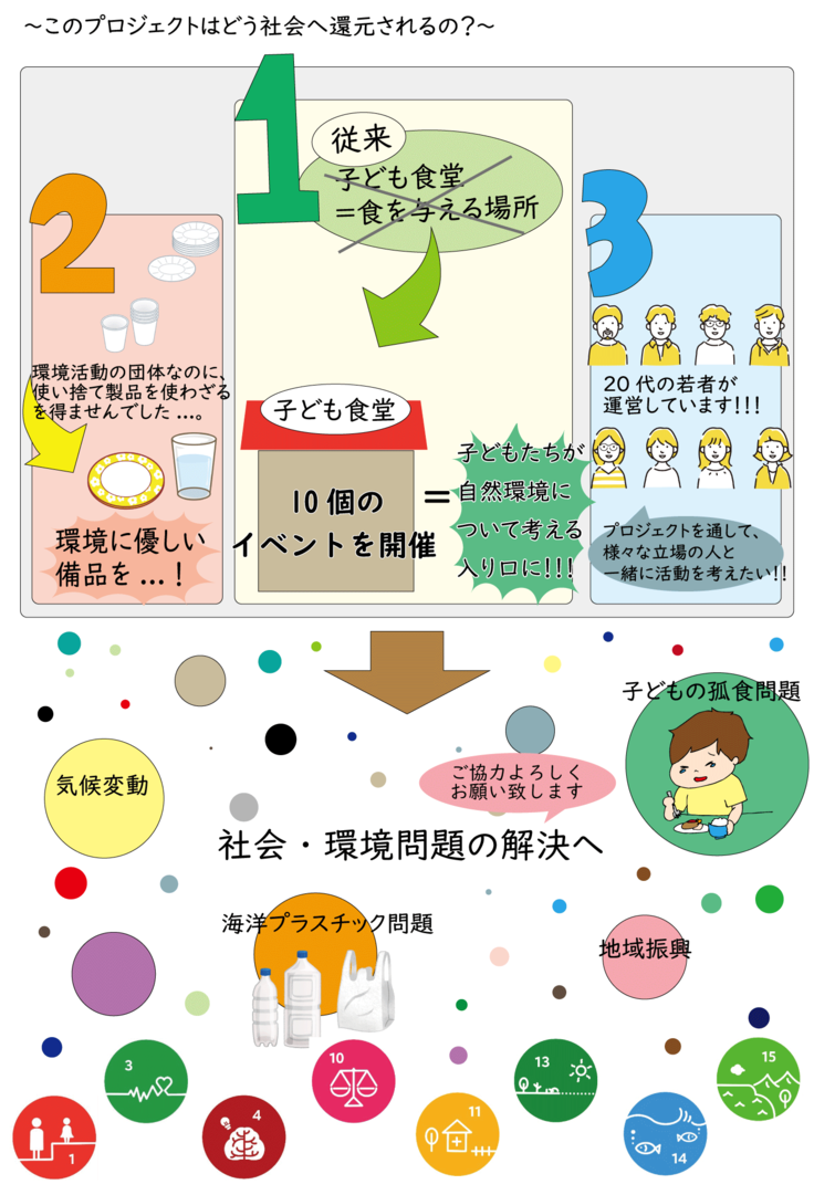 目先の活動だけに囚われず、運営メンバーと子どもたちが一緒になって学んで成長できる空間にするために今回のクラウドファンディングで資金を調達することで、ただ食事をする「場所」から、環境問題を通して、社会全体を見つめる「学ぶ場」へと進化させることができます。