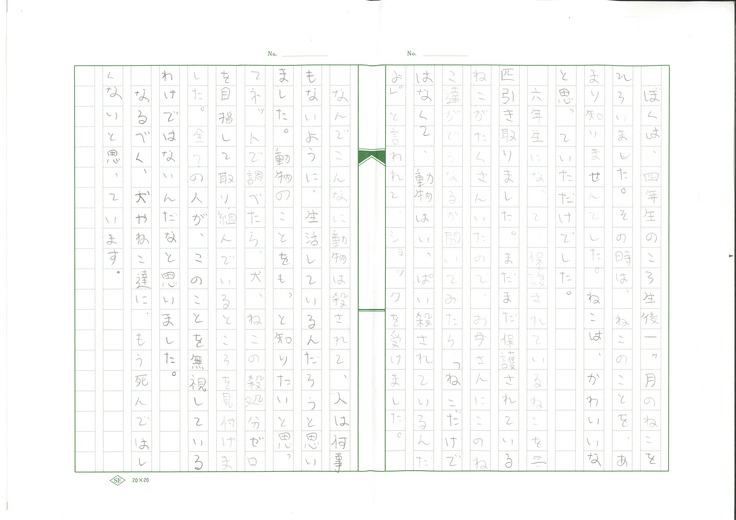 「僕は夏休み中に、猫をたくさん保護しているところから2匹もらったんだけれど、他の保護された沢山の猫達がどうなっているのか気になりました。後で母から『もらい手のない猫は殺されちゃうんだよ』ということを聞きました。動物でも一つの命だから、何か協力できることをしたいです。」