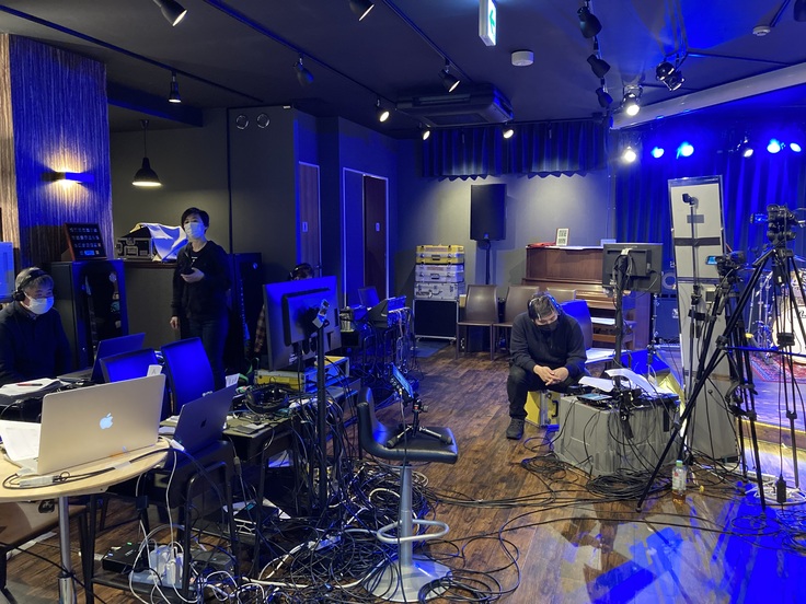たくさんの機材と配線の数! 機材スタッフさんも大勢いらっしゃいます。この機材で、このスタジオと、学生さんたちのZoom、そして審査員の方々のZoomとをつないでいるんですね~。