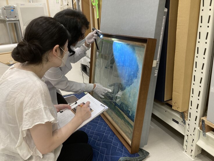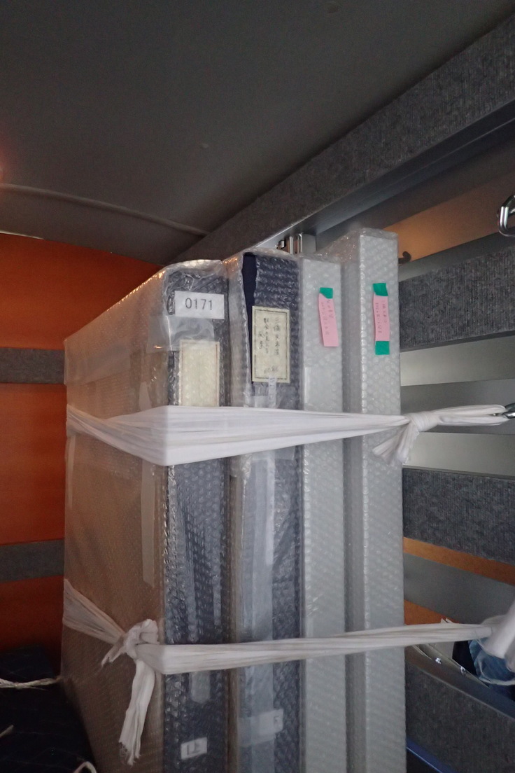 収蔵庫からの出庫前に作品を点検、梱包の上、作品保護のため空調やエアーサスペンションの設備のついた美術品専用車で運搬をおこないました。