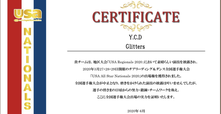 日本のチアダンサーの夢の舞台、USA nationals(全国大会)も、1度は夏への延期が発表されましたが、感染者数は増加の一途をたどり、後に延期→中止へと訂正され、その瞬間、Glitters結成からの悲願Jonior部門での全国大会進出は幻となりました。