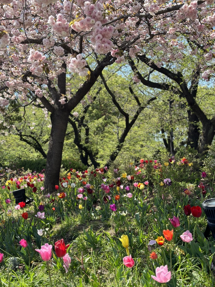 ▽去年チューリップ🌷を植えた場所、上には桜の見事な共演