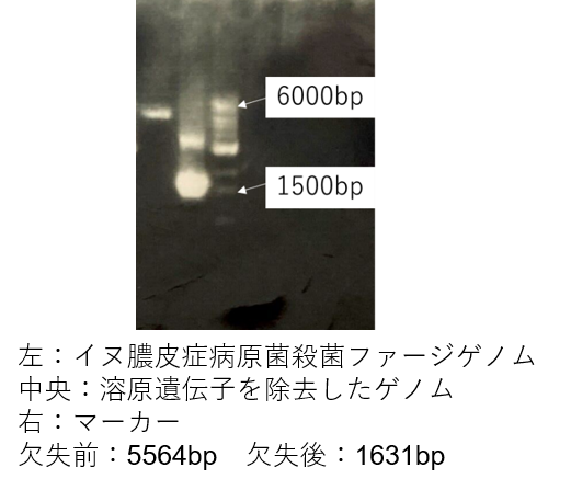 溶原遺伝子がある状態だと6000bpと呼ばれる長さになりますが、溶原遺伝子を取り除き、1500bpと呼ばれる長さになりました。