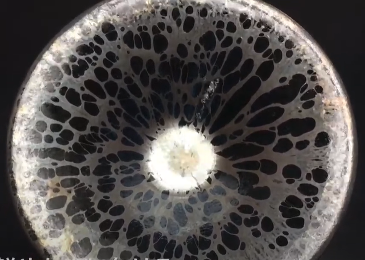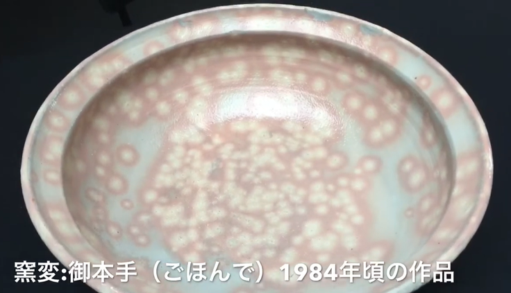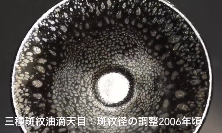釉薬の調合もさることながら、窯の改造など微調整を重ね「虹彩薄膜」の構造色で銀青色から紫、金色などの範囲の色が概ね出るようになりました。全体的に薄膜が覆い、煌びやかさのある「面虹彩斑紋型」曜変天目です。