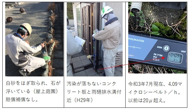 しかし、子供らの進学も在り、屋上の汚染物の夫婦2人での運び出しは、重さ10㎏以上の汚染のしみ込んだコンクリート板など約300㎡に1,000枚程と石や砂利など数トンの枯山水庭園の資材が残っており、上り下りには狭い螺旋階段しかなく、持ち出しは困難と判断しました。