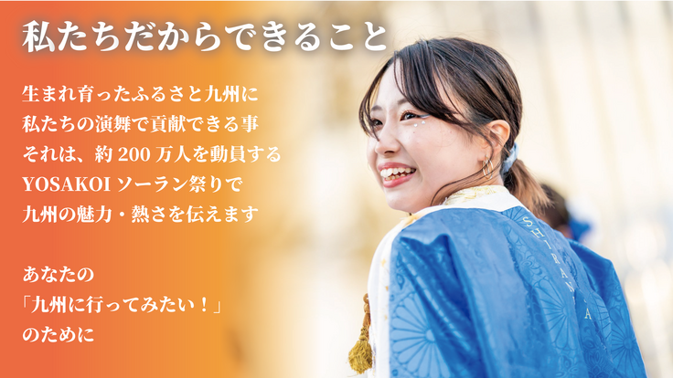 このように、私たちの演舞がわずかでもふるさと九州への貢献に繋がり、チームとしても高い目標を掲げることで、私たちの秘めた可能性を最大限にぶつけたい、大きな挑戦へと立ち向かう姿を見せて九州を盛り上げたい、そんな想いから次のステージとして、約200万人を動員するYOSAKOIソーラン祭りのファイナルステージ出場という目標といたしました。