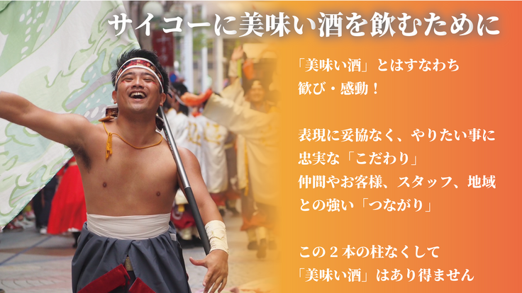 学生の時にはできなかった表現や組織運営など新しいことにどんどん挑戦し、仲間やお客様、地域の方々すべての関係者との歓び・感動を「美味い酒」という言葉に込め、「サイコーに美味い酒を飲むために」というチーム理念だけは変えずに今日まで運営してきました。