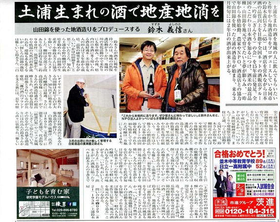 本2月1日配布の常陽リビング(茨城県南地域24万部無料配布のタウン誌)の一面トップ記事で、NPO会員で小町の里での農商工連携の酒造り(この事業)でプロデューサーをなさっている地元の有名酒店、土浦鈴木屋さんの鈴木社長が紹介されています。 NPO代表の奧田も呼ばれてお話させていただいたので、ちゃっかり写っています。