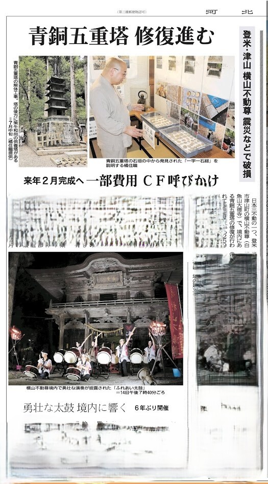 9月23日の河北新報朝刊に、この度の青銅五重塔の修繕事業のことを大きくとり上げていただきました。皆様にもお知らせしたいと思いながらも紙面をまるまる転載することは著作権上、控えなければと思っていたら、ネットニュースになっていたのでそちらでご覧ください。