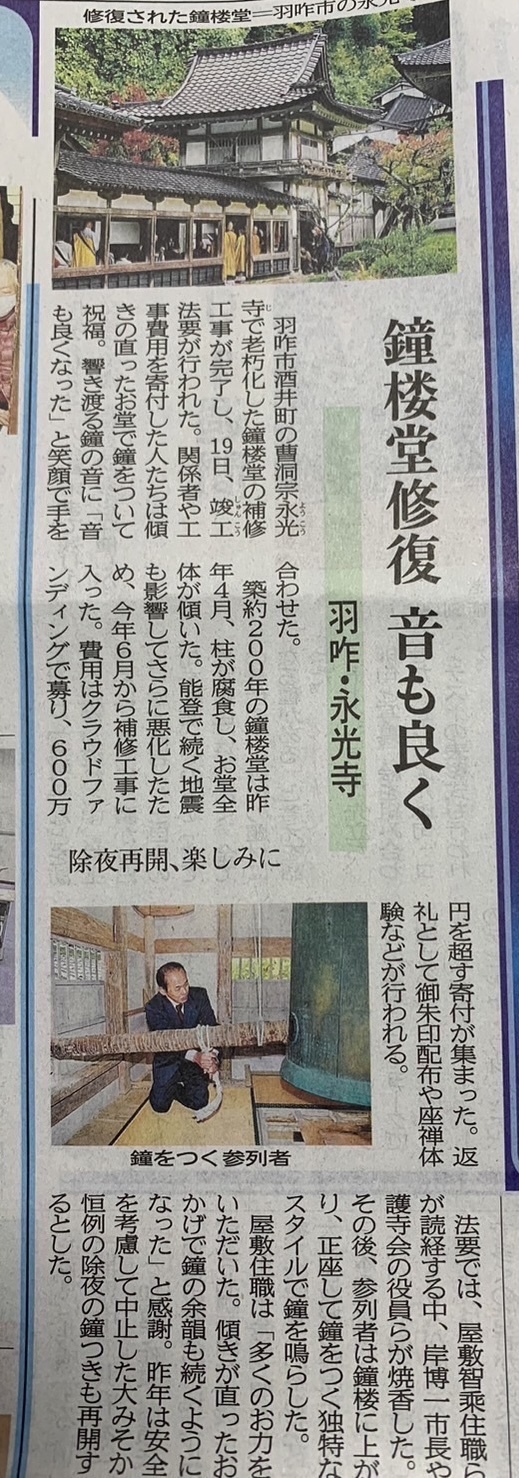 ご報告|無事完成!新聞に鐘楼堂竣工式の様子が掲載されました