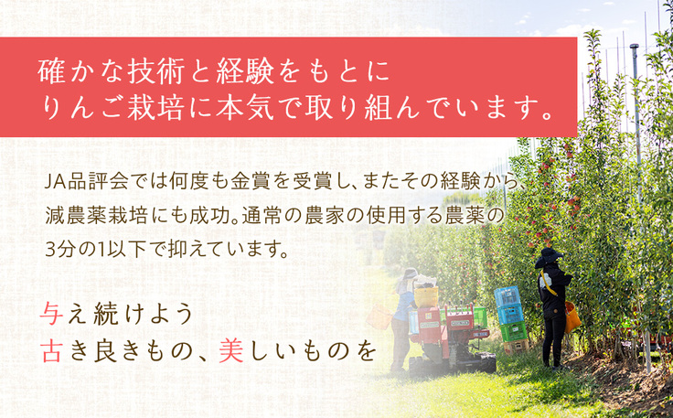 世界最先端の高密植栽培という栽培方法を取り入れ、長野県うまい果物コンクールで5年連続入賞、長野県知事賞2年連続受賞の実績があります。