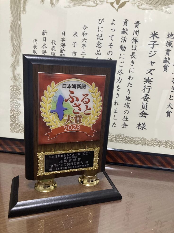 でもこんな楽しいイベントが一年に一度ぐらい米子にあっても良いと思うんです。そんな思いが評価されたのか、先日、米子ジャズ実行委員が「日本海新聞ふるさと大賞2023地域貢献賞」を受賞することが出来ました。「地域音楽コーディネーター」認定資格も取得して、更に米子ジャズが良いものになるよう努力をし続けてます。