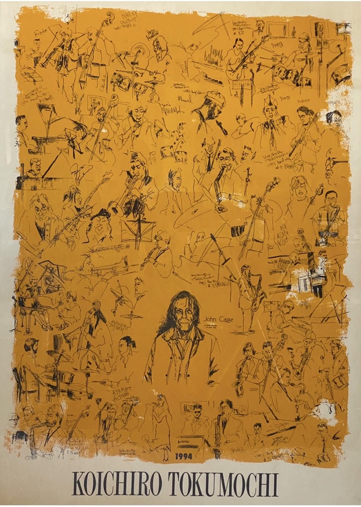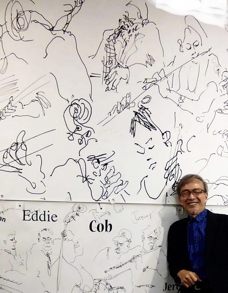・・・私は初回からミュージシャンをスケッチしていた。2,3年描き貯めたスケッチを版画にして展覧会もやった。スイングジャーナルに毎月投稿し「読書欄」の常連に。そしたらある時、ジャーナルから連絡あり、1Pのイラストを描かせてもらった。4年目にはレギュラー(1993)に。そこからアルファレコードからオファーあり、15枚のジャケットを描いた(シルクスクリーン版画)。