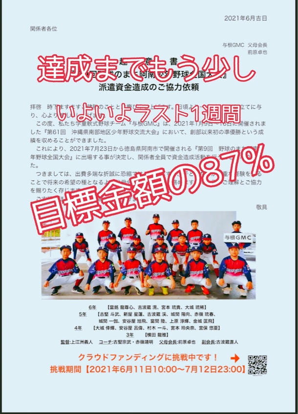 引き続き、沖縄県代表として全国大会に出場する与根GMCへのご支援・応援のほどよろしくお願いします🙇♂️