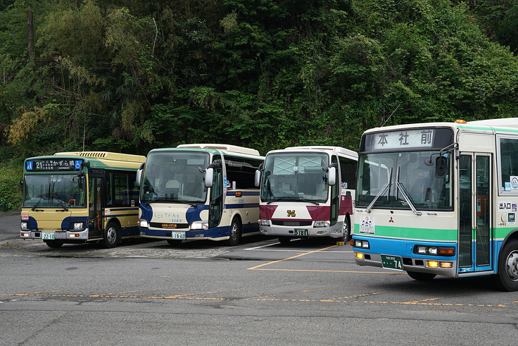 車庫に戻ったボンネットバスは他の車両と合わせて撮影