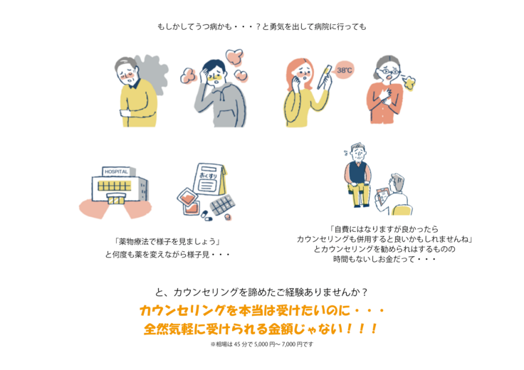 カウンセリング料金の相場は、45分で5,000円~7,000円です。これは、本当に深刻な悩みを抱えている人やお薬代がかかる中で気軽に利用したいと思える金額ではありません。