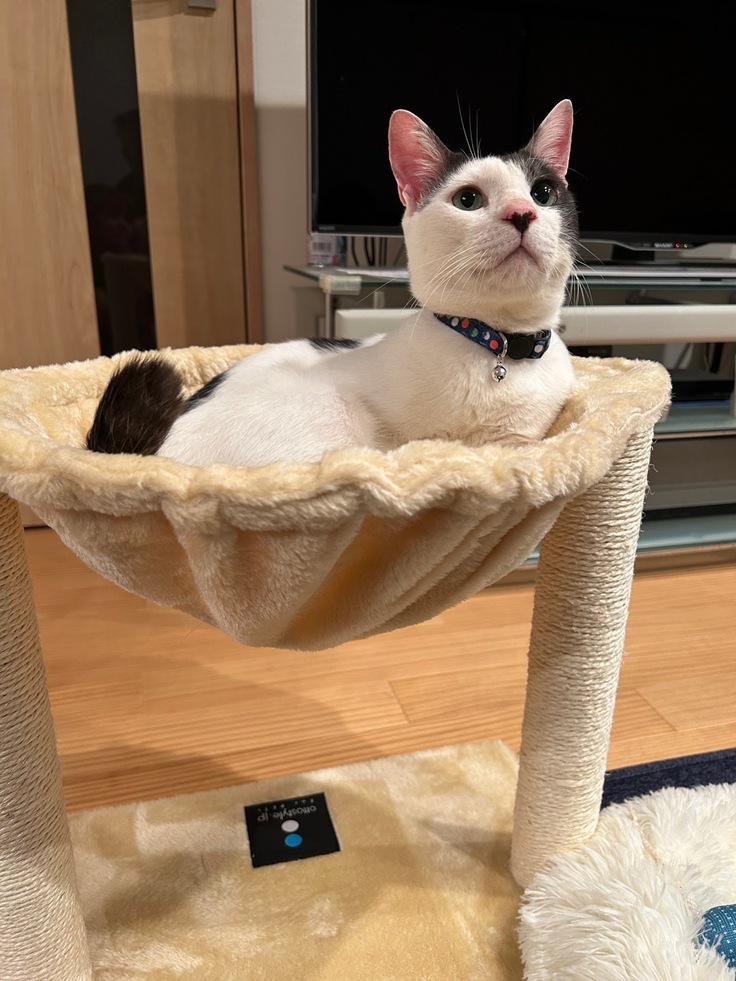 2023年7月中旬に私の友達に保護されました。初めて猫を飼うため、友達一家の迎えの準備が整うまでうちで預かっていました。当初は2週間ほどの予定でしたが、友達の子どもちゃんがオレオがケージの中にいれば大丈夫だけど、オレオがケージから出たらめちゃくちゃビビって触るどころか逃げ惑ってしまうということが発覚し😂、ひとまず延期しようと言う話になりました。その子が逃げてもオレオは人懐っこくおしゃべり猫だったので『わぁーわぁぁぁあ』と鳴きながら、目をみつめて小走りでその子を追いかけるし(触ってほしくて)、当初はガリガリだったので余計にその子からしたら怖さ倍増だったかもしれません😂