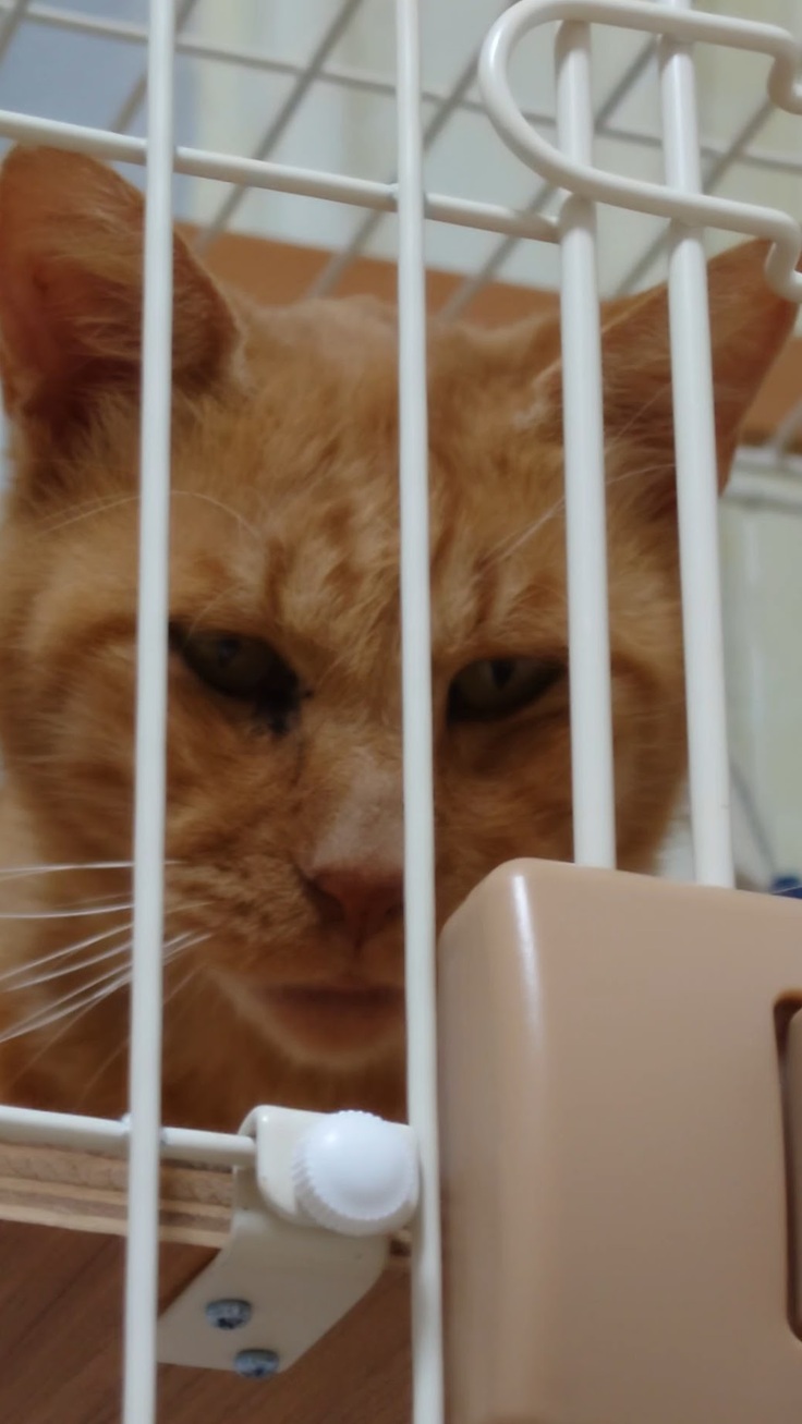 🐈ケージ越しから、にらみを効かせるヨッちゃん。