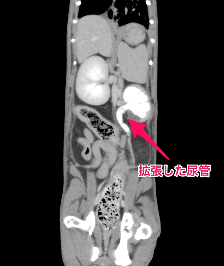📣1つ目は何かしらの原因で尿管が詰まっていて左側の腎臓と腎盂が肥大して左側の腎臓がほぼ機能していない状態。