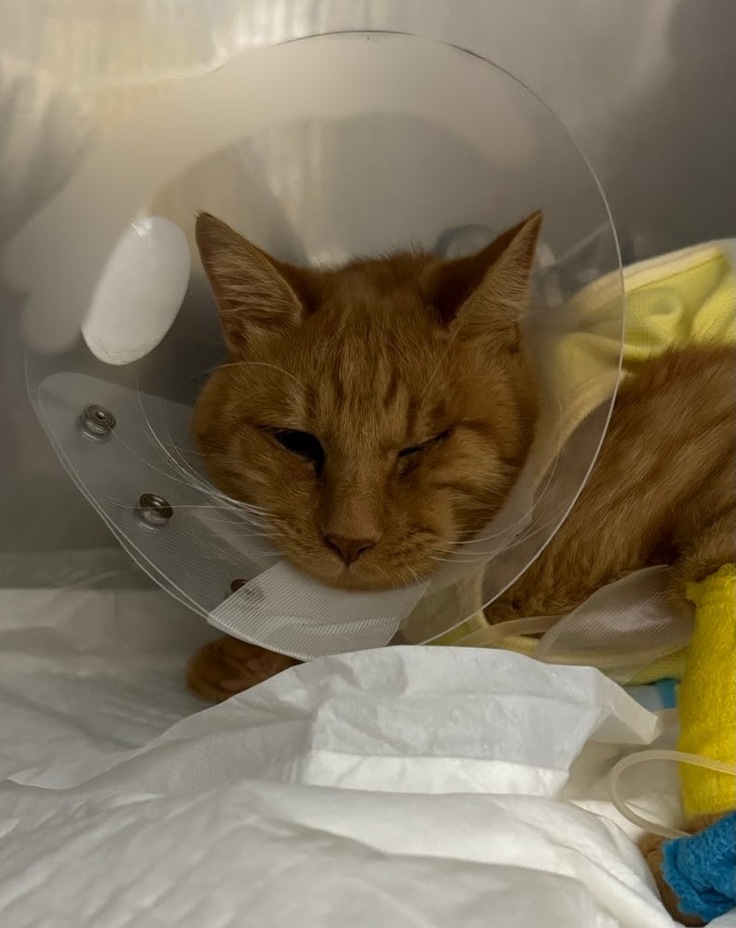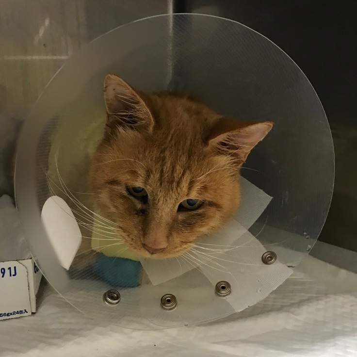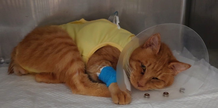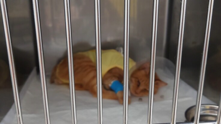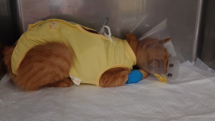 🐈11/4(土)手術が終わり、無事に麻酔から目覚めたヨッちゃん。カテーテルとドレーンと点滴の管をつけてもらっているヨッちゃん🐈