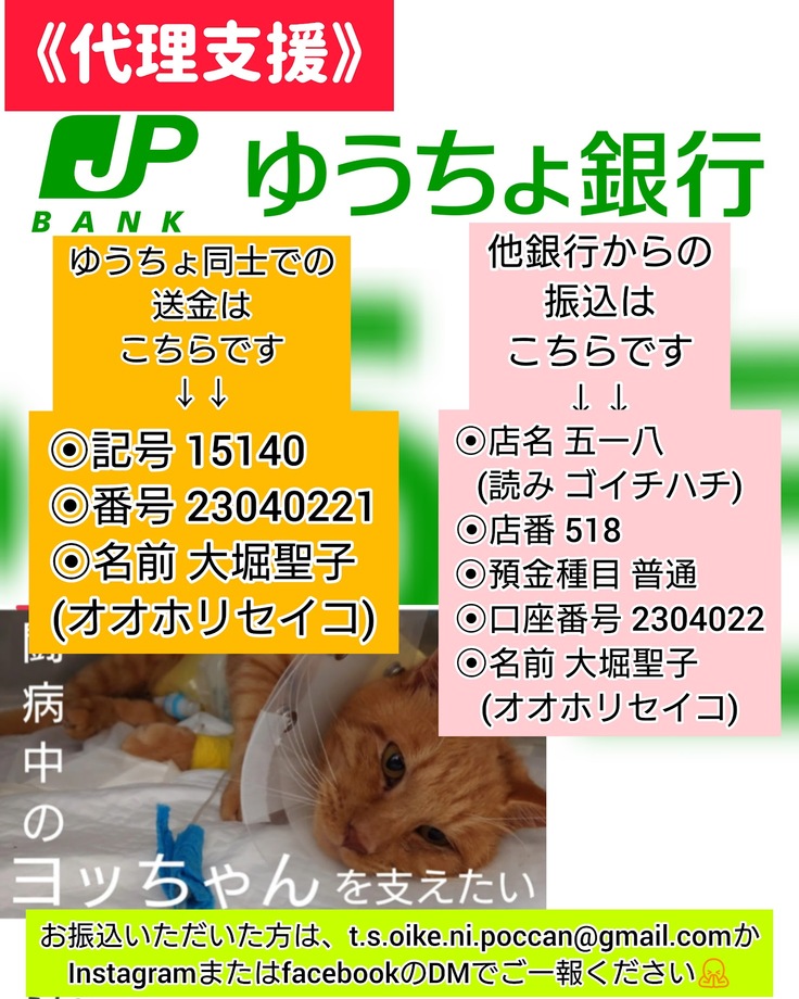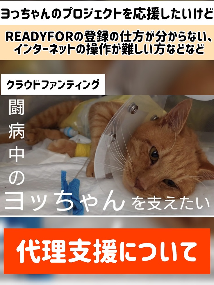 ※目標金額未達成でプロジェクトが成立しなかった場合はみなさんに返金されるので私には1円も入ってこないのですが、もし、2月21日(水)23:00以降でヨっちゃんや他の猫たちのためにご支援いただいた金額についてはSNSでご報告させてもらって(お名前はイニシャルにさせてもらいます)、ヨっちゃんのずっとの治療費や療養食フードや他の猫たちのために大事に使わせていただきたいと思います😭