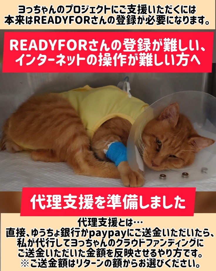 ヨっちゃんのプロジェクトを応援したいけど、READYFORの登録の仕方が分からない、クレジットカードを持ってない、インターネットの操作が難しくて支援金の送り方が分からない方など向けに、銀行とpaypayの2つの代理支援先を準備いたしました🙇