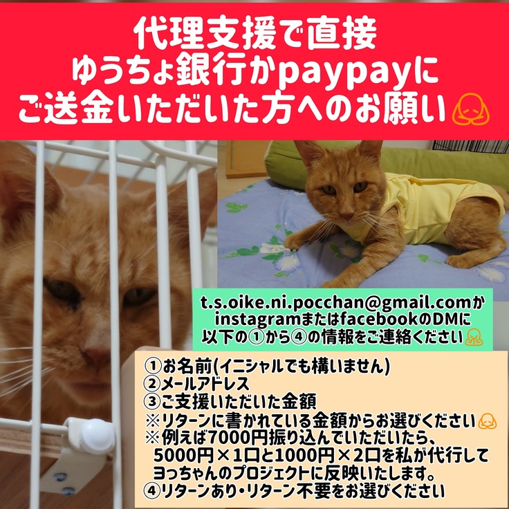 銀行またはpaypayにご送金してくださった金額は、私の方で代行してヨっちゃんのプロジェクトに反映いたします。