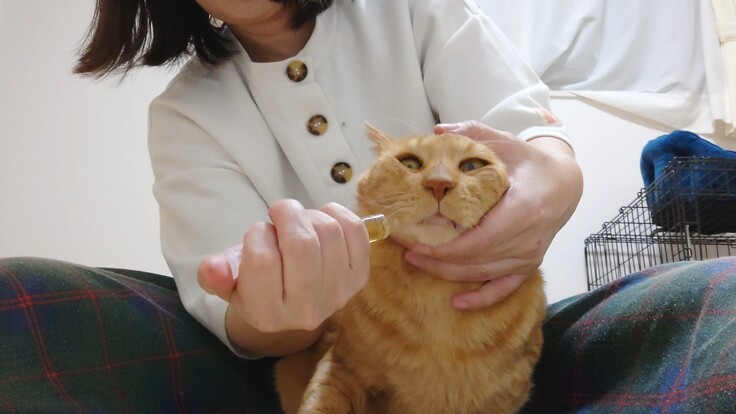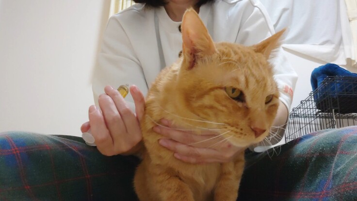 これは注射じゃなくて、シロップタイプの飲み薬なんだよ。いろいろ試してヨッちゃんの体質に合うお薬を探すの。🐈
