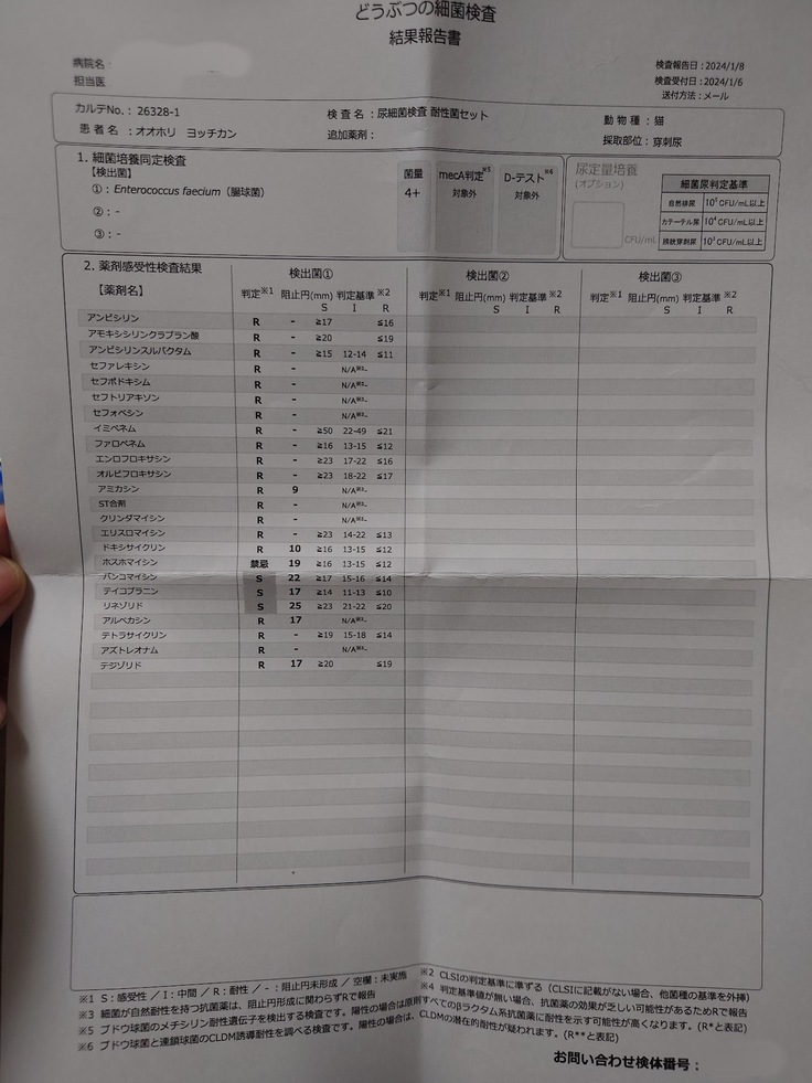再度、処方してもらった別の抗生物質をかかりつけの動物病院にもらいに行き、それから1週間後に外注検査に出していた薬の検査結果が届きました。判定のところにRと書いてあるのはもう耐性がついていて使えない薬で、Sと書いてあるのがヨッちゃんが効く薬だそうです。