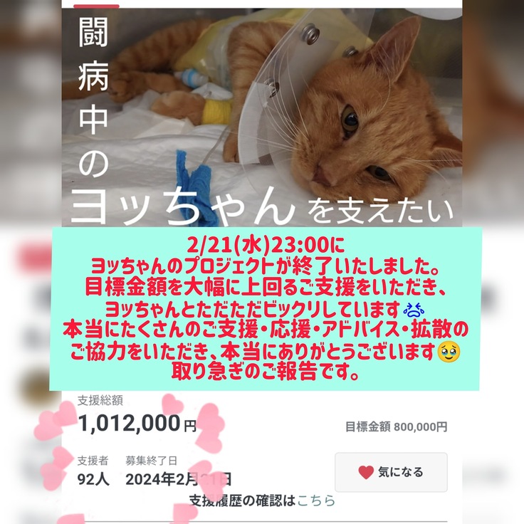 🎊2/15(木)にヨッちゃんのクラウドファンディングが達成、2月21日(水)23:00で終了いたしました😺12月24日(土)にヨッちゃんのプロジェクトを公開させてもらってから約2ヶ月。ヨッちゃんのために目標金額を大幅に上回るたくさんの温かいご支援・応援・アドバイス・拡散のご協力をいただき、本当にありがとうございます😭