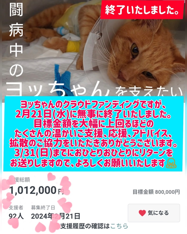 🎊2/15(木)にヨッちゃんのクラウドファンディングが達成、2月21日(水)23:00で終了いたしました😺12月24日(土)にヨッちゃんのプロジェクトを公開させてもらってから約2ヶ月。ヨッちゃんのために目標金額を大幅に上回るたくさんの温かいご支援・応援・アドバイス・拡散のご協力をいただき、本当にありがとうございます😭