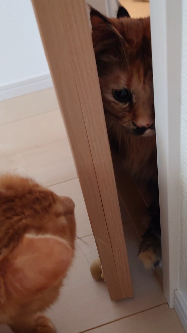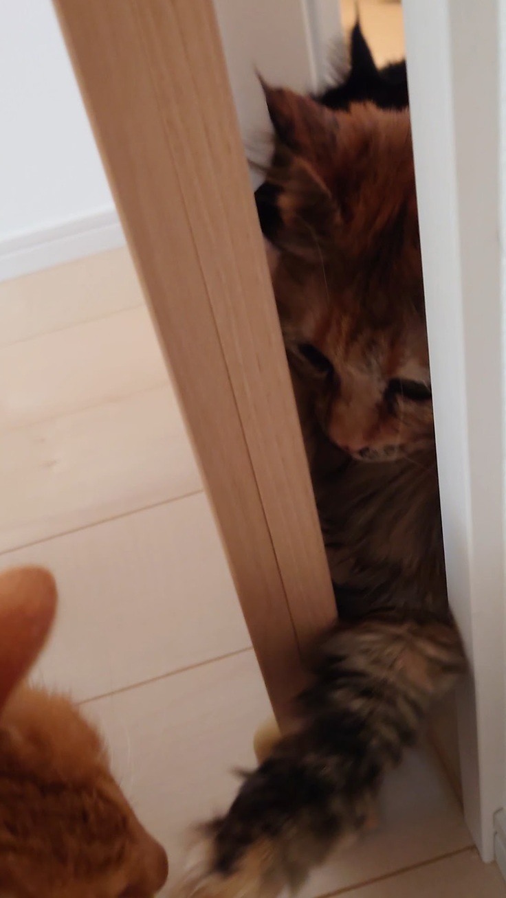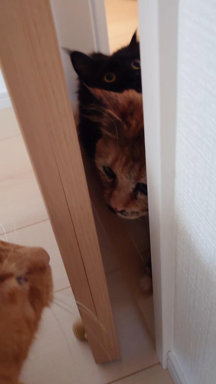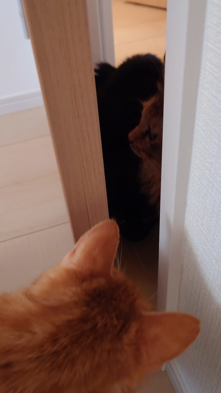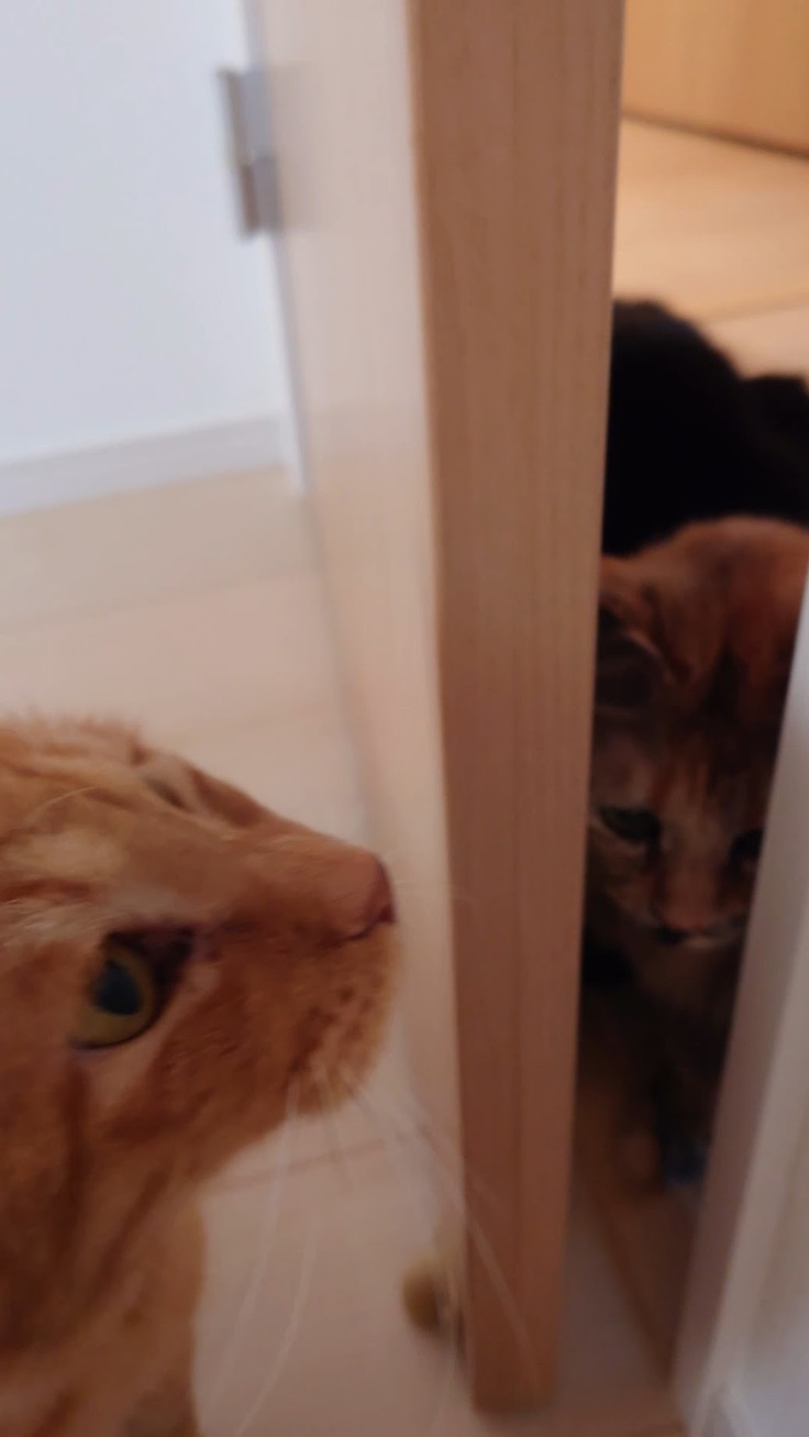 他の猫たちがどう反応するか分からないから、ドアをちょっと開けるとこから始めてみようか🐈
