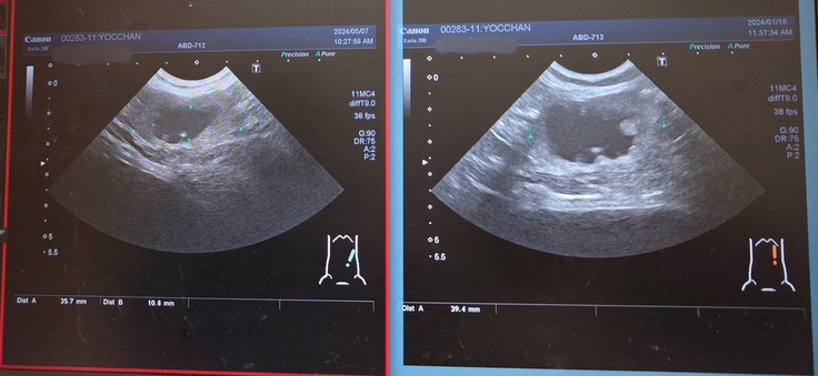 左側の腎盂は相変わらず肥大したままでエコーが黒く写っていました。
