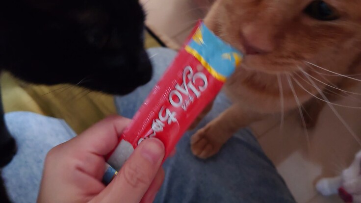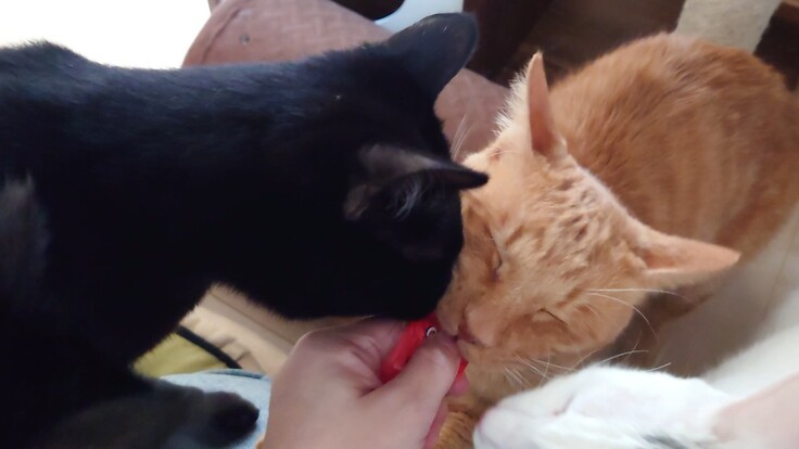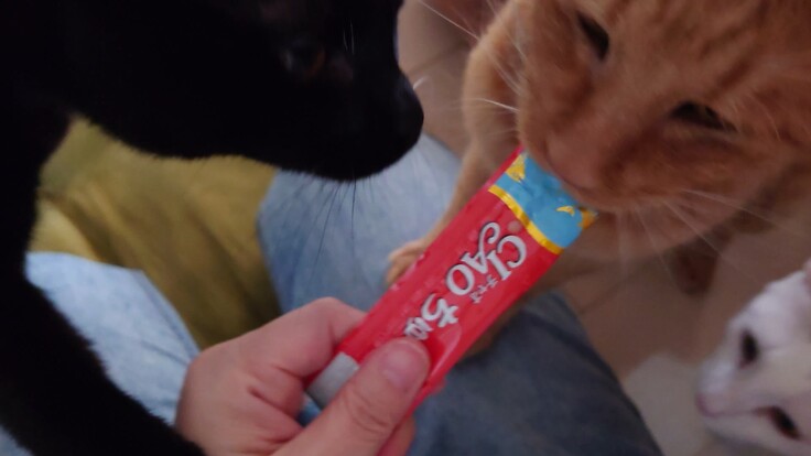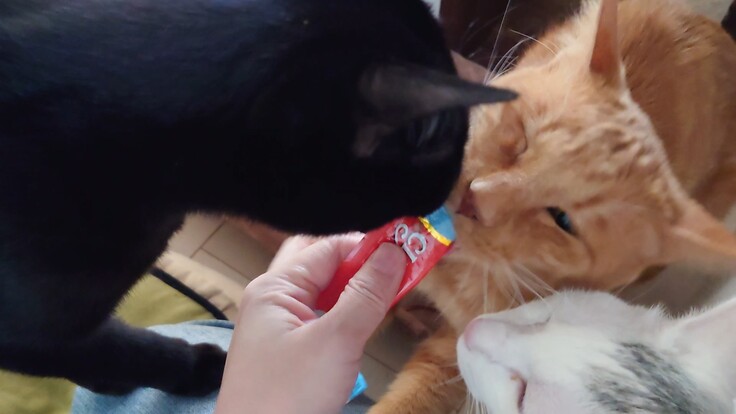 家に帰ってから通院を頑張ったヨッちゃんと、お留守番を頑張ってくれた猫たちにごほうびのチュールをあげました。ひとり1本あげたいところだけど、うちは2本を9匹で分けるスタイルでやらせてもらってます😂
