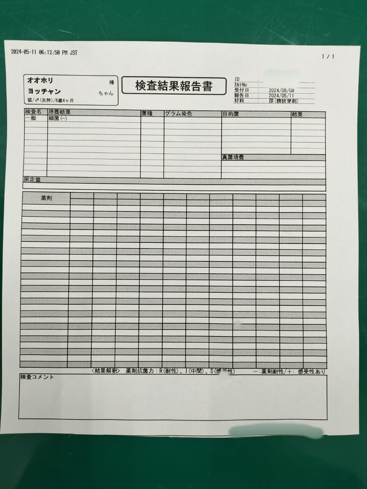 ヨッちゃんのおしっこを取って外注検査に出した結果が1週間後に帰ってきたので再度病院に行きました。組み合わせた薬が効いたようで尿路感染の細菌は陰性という嬉しい結果が戻ってきました😊