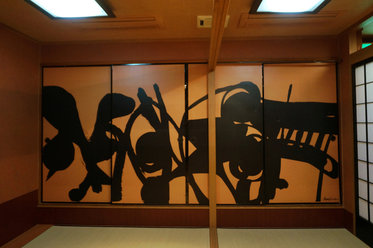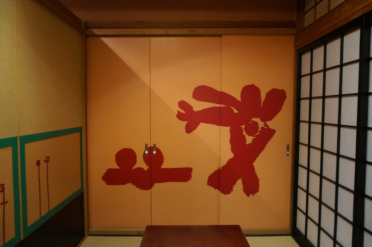 歓中店の壁やふすまには、筆で一気に描かれた抽象的な絵や様々なフォルムを組み合わせた絵など、ここかしこが芸術作品で彩られています。