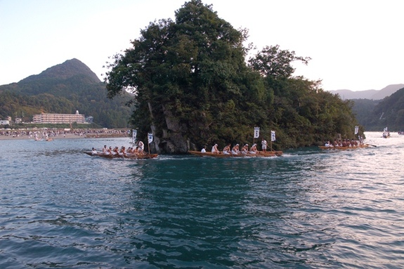 熊野川河口にある島で、毎年10月に熊野速玉大社の大祭「御船祭」が行われます。9隻の船が御船島を三周し、先着を競います。かけ声と船をこぐ音は豪快です。