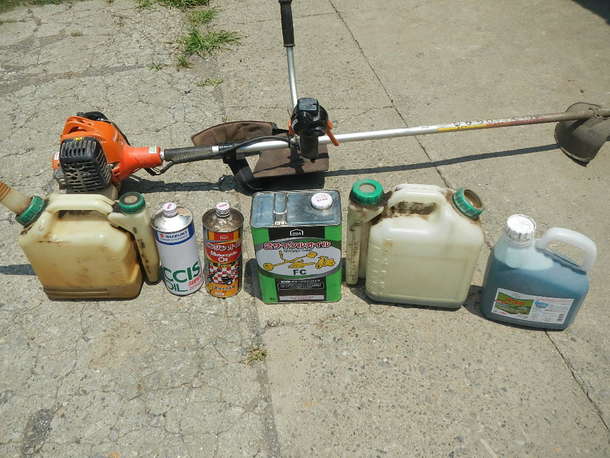 オイルの缶に刈り払い機の絵が有ったので入れたようです、下の方に小さく混合用と書いてあります、右端のオイルとそっくり色の液体は、除草剤です、見た目は、変わりませんが、まったく用途が違います。教えなければいけない事がまだまだ山のようにりますね。フウ!