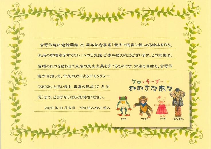 ※絵本制作完了は2021年7月を予定していますが、サンクスレターは2020年11月までにお送りします!