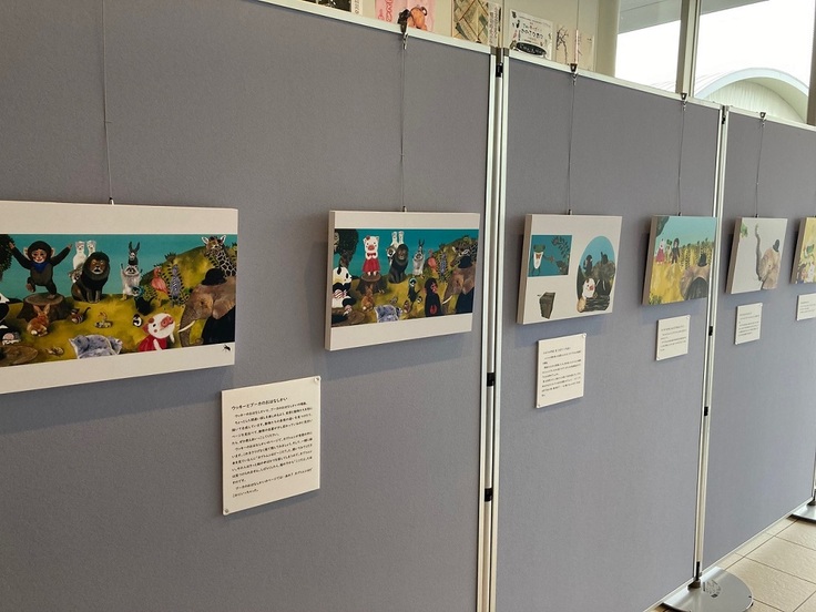 絵本の作画デザインパネル展示会。会場は大崎市図書館エントランスホールです。こちらの会期は4月14日(木)まで。