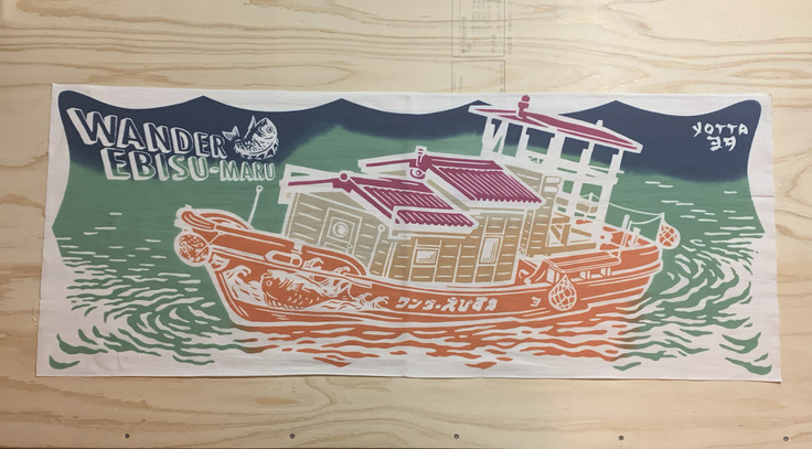 写真は、本染めのえびす丸の手拭いです。注染という伝統的な手法で作ったものです。