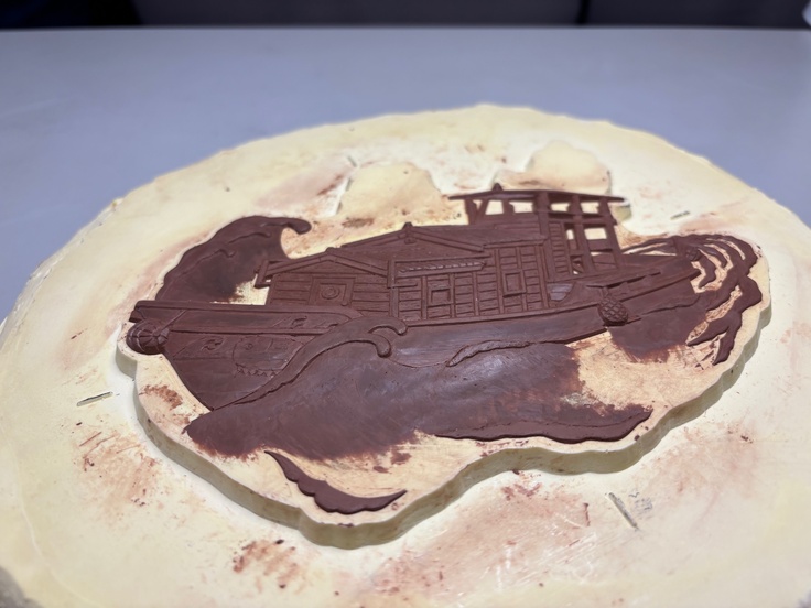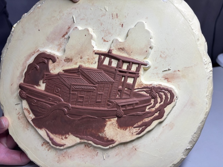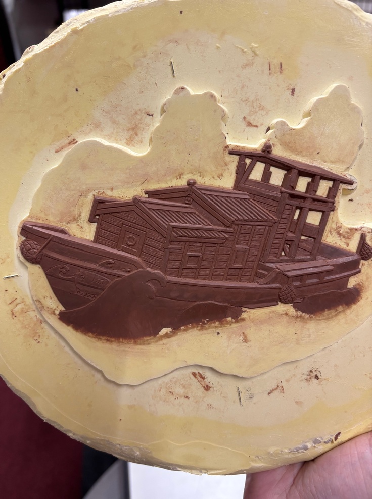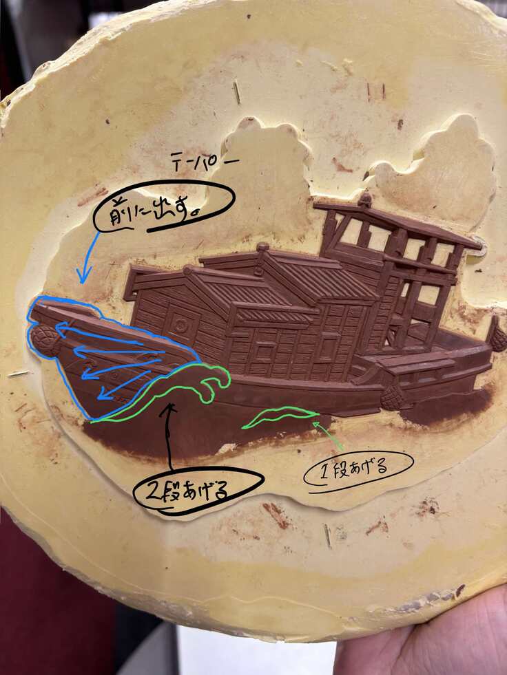 まずは描いた絵からどのように立体にしていくか職人さんが大きいモデルを作り、そこで形や凸加減のチェックをしたあと、着色する部分の色の合わせなどを行い、出来上がっていくという感じです。