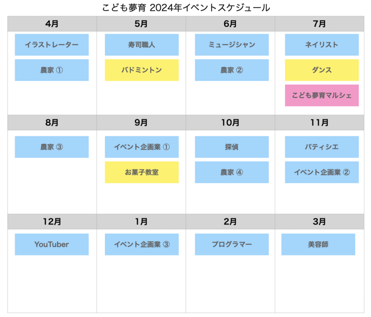 私たちの強みは、”お仕事体験会”の開催頻度が豊富なことです。 子どもたちにとって体験ができる機会は、経験でもあり最大の学びだからこそ、定期的にお仕事体験ができるように、毎月様々な企画を予定しています。